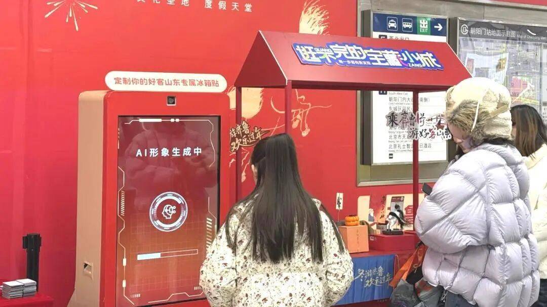 在“面对山东,AI在其中”山东定制雪柜贴打印区,旅客通过AI拍照与山东各地地标景不雅杜撰打卡合影,透过一个小小的雪柜贴,将富余特质的山东东说念主文当然风景浓缩于方寸之间,把都鲁地面的好意思好带回家。