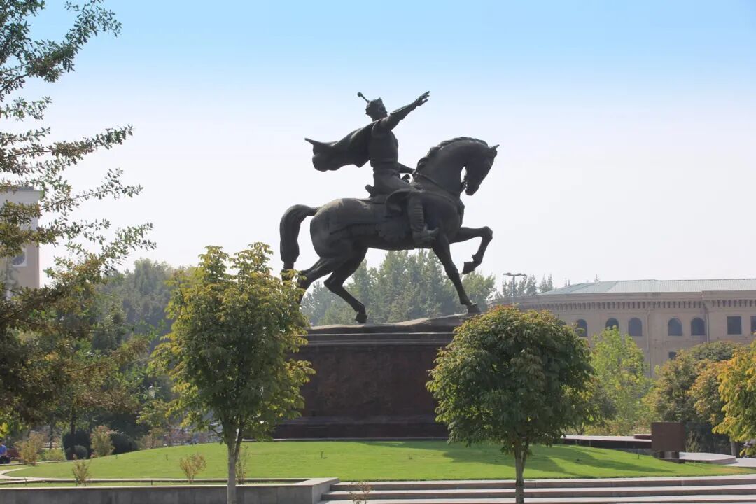 广场中间,帖木儿大帝骑着马的铜像高高立着,被绿油油的梧桐树围着,相配矜重。