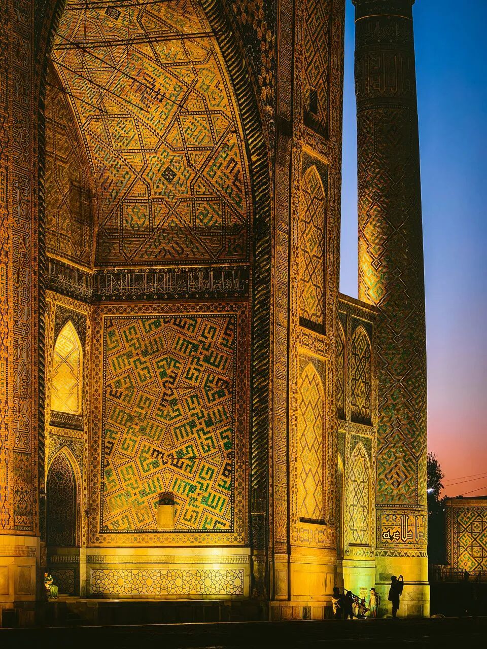 当夕阳的金光洒下来,给那三座雄伟的伊斯兰神学院披上一层流动的金纱,墙上那些青蓝色的马赛克,每一派都在柔声讲着帖木儿帝国往常的光泽。