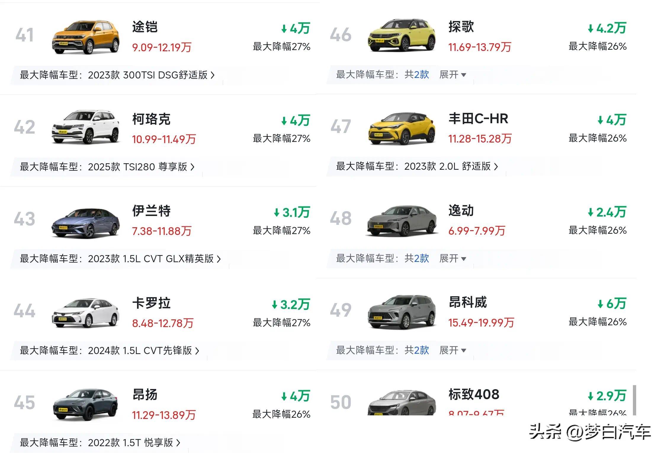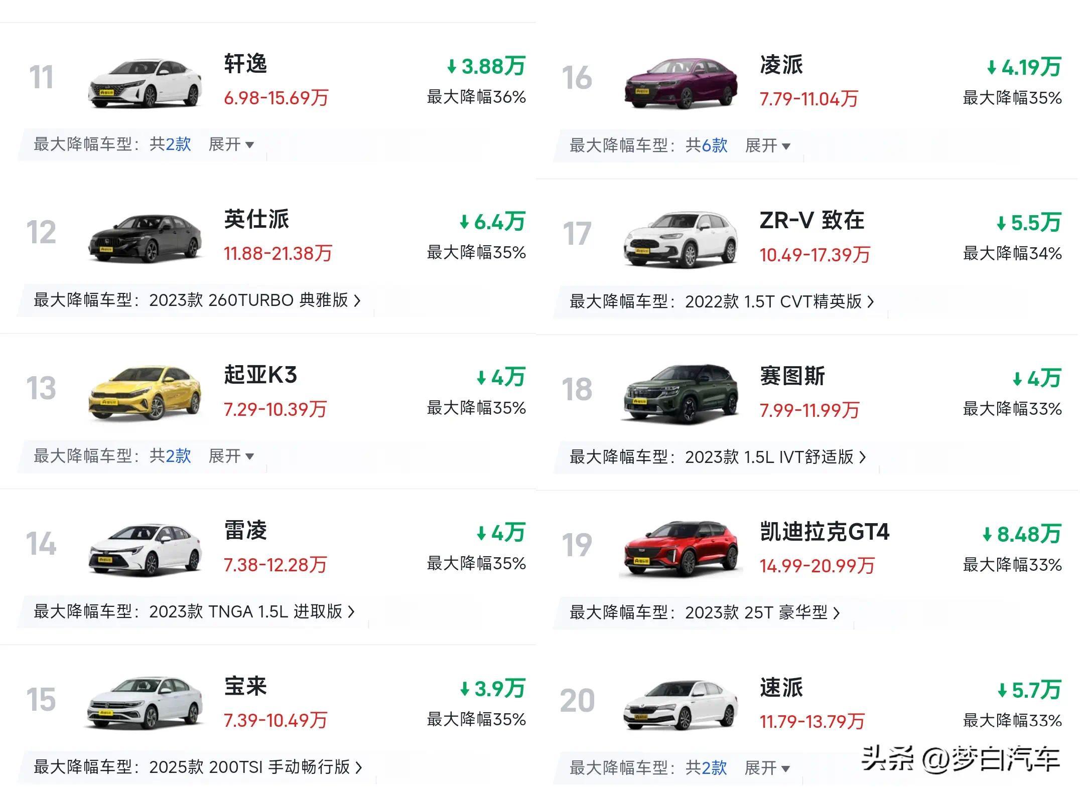 大多半主流燃油轿车也未能打发压力,别克威朗和本田想域得回了冠亚军,最大降幅卓绝了40%,想域的起售价不及8万元。大众朗逸和雪佛兰科鲁泽也皆是入榜前十,朗逸降价3万摆布,起售价唯有5万多,科鲁泽降价3.5万摆布,起售价亦然跌破6万。日产轩逸名秩序11位,丰田雷凌名秩序14位,大众宝来名秩序15位,三款车型的降价幅度皆卓绝了35%,轩逸降价3.88万之后,起售价也不及7万,雷凌和宝来也降价4万摆布。