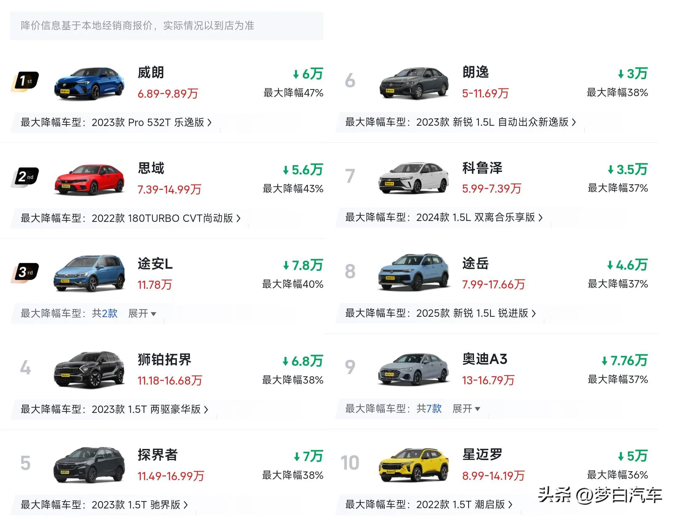 跟着新动力汽车的马上崛起,国内燃油车出现了供给饱胀、库存压力加剧等情况,是以各大车企为了掠夺市集份额,纷繁运行大降价,酿成了“断臂求生”的面目。懂车帝数据表露,最大降价幅度卓绝30%的车型足足有32款,其中像别克威朗、本田想域、大众朗逸、雪佛兰科鲁泽以及大众途岳等主流结伙车型,皆是入榜前十名,日产轩逸、丰田雷凌、大众宝来、哈弗H6、本田雅阁以及本田CR-V等车型,也皆加大了市集让利幅度,本田雅阁降价后的起售价不及12万,比好多紧凑型车的价钱还低。(燃油车降价信息基于上海地区经销商报价,实质价钱仍以到店为准)