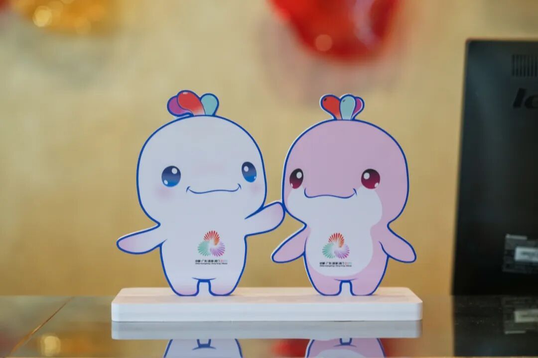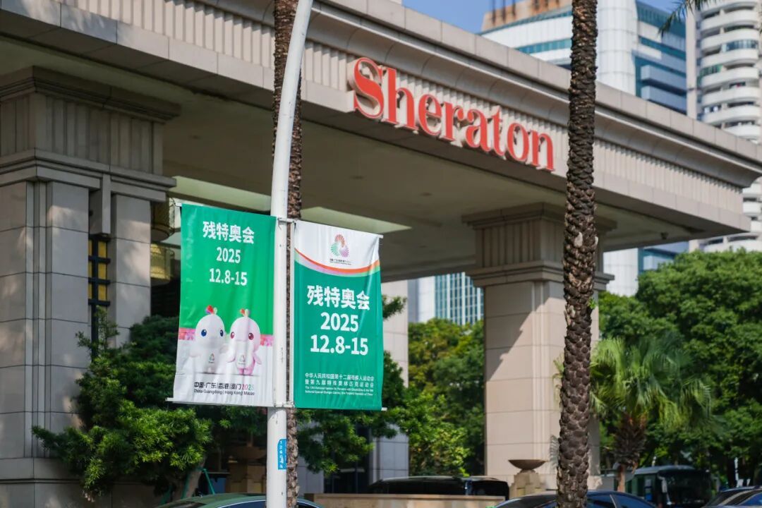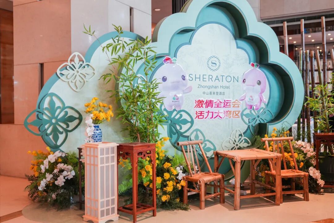 坐落于岐江西岸的喜来登酒店,已悄然融入十五运元素。门口灯柱上宣传海报整王人罗列,步入大堂,祯祥物“乐滋滋”“乐融融”笑貌相迎,与前台赛当事者题展板相映生辉,让每一位客东说念主从抵达短暂便感受到赛事的温馨与专科。