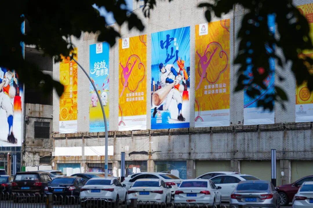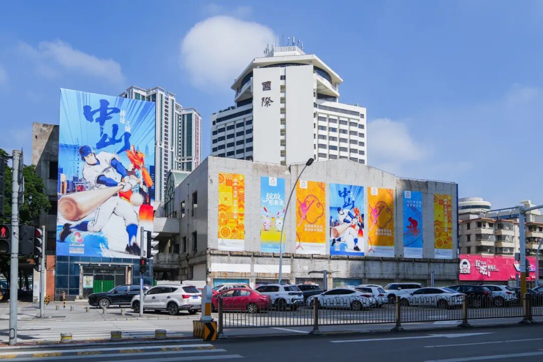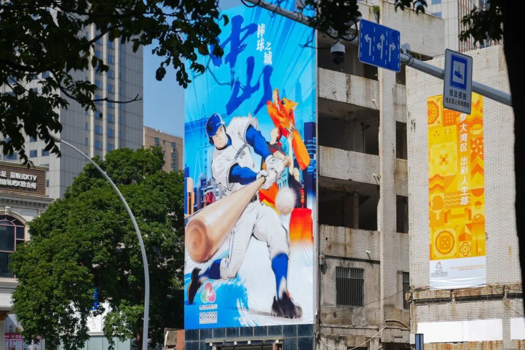 在活水游龙的中山通盘西区段,一幅幅棒垒球主题巨型海报相等引东说念主刺眼。画面中,通顺员挥棒出击的飒爽身影、垒球划破漫空的轨迹,与绿意盎然的街景互相烘托,组成一说念动感与好意思感交汇的城市表象。