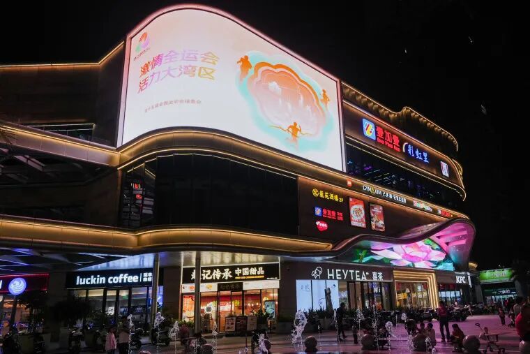 走进东说念主流如织的商圈,巨型电子屏正轮回播放十五运主题海报。跃动的画面与口号,将体育情谊传递至街巷每一个边缘,诱惑繁密市民安身不雅看、拍照打卡。