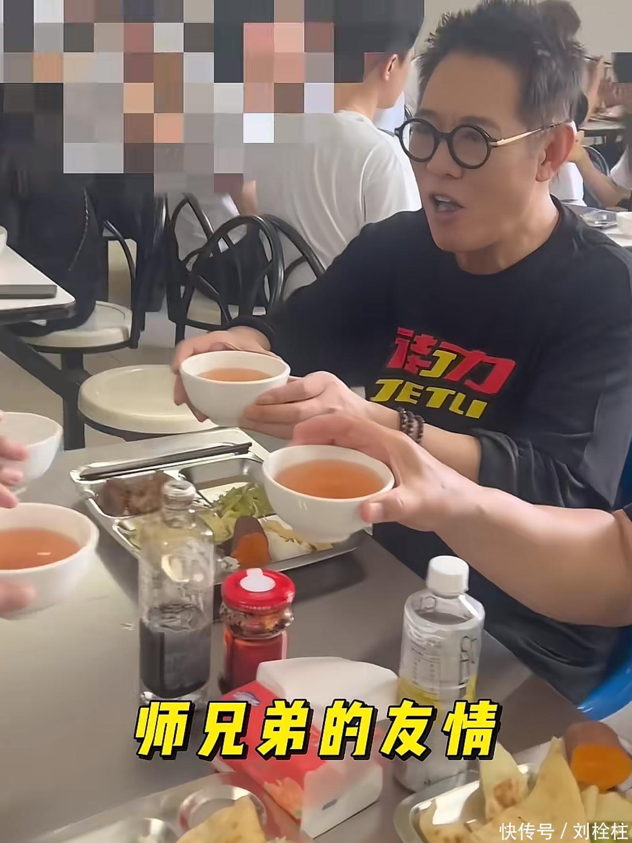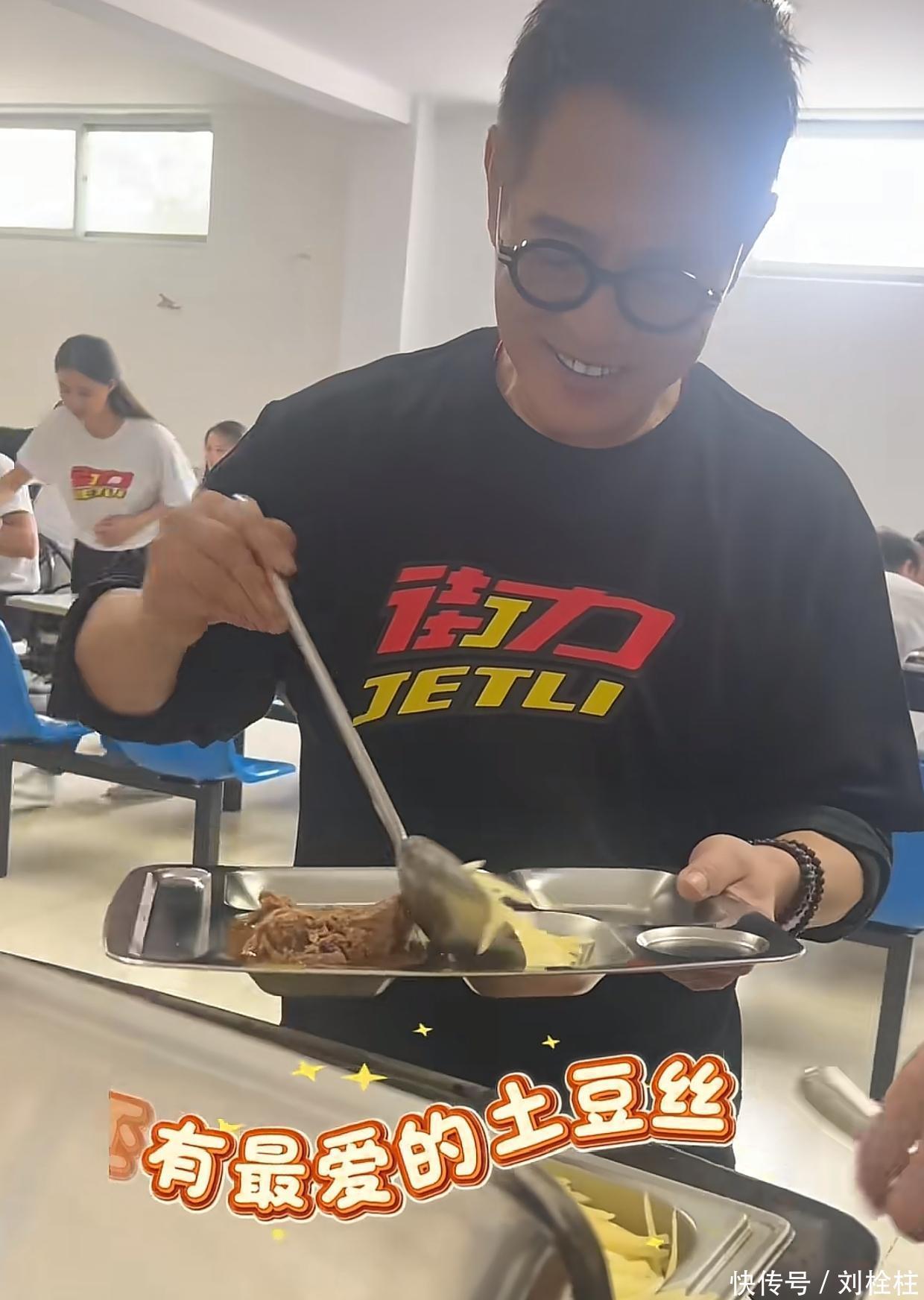 李连杰此次去探班吴京,吴京请李连杰吃基地食堂,食堂的饭菜很简短,就一个荤菜,三个素菜。