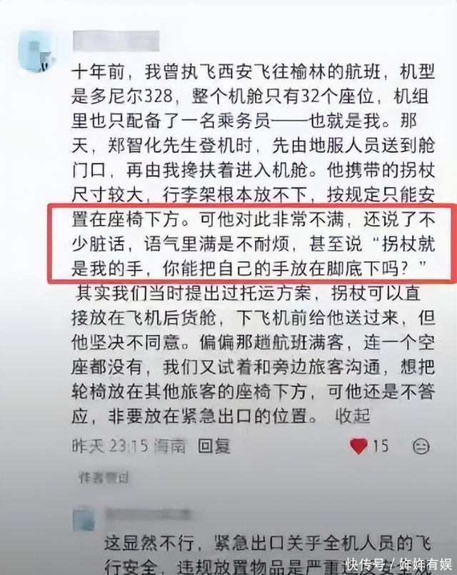 但是他阿谁手杖特大,行李架上根蒂放不了,飞机上的法例只可放在座椅下边。 后果郑智化不仅不互助,反而骂骂咧咧的为难她,非得把我方的手杖放到首要出口。 郑智化的口碑骤然没了,径直成了一个张口即是撒谎的老坏东谈主。