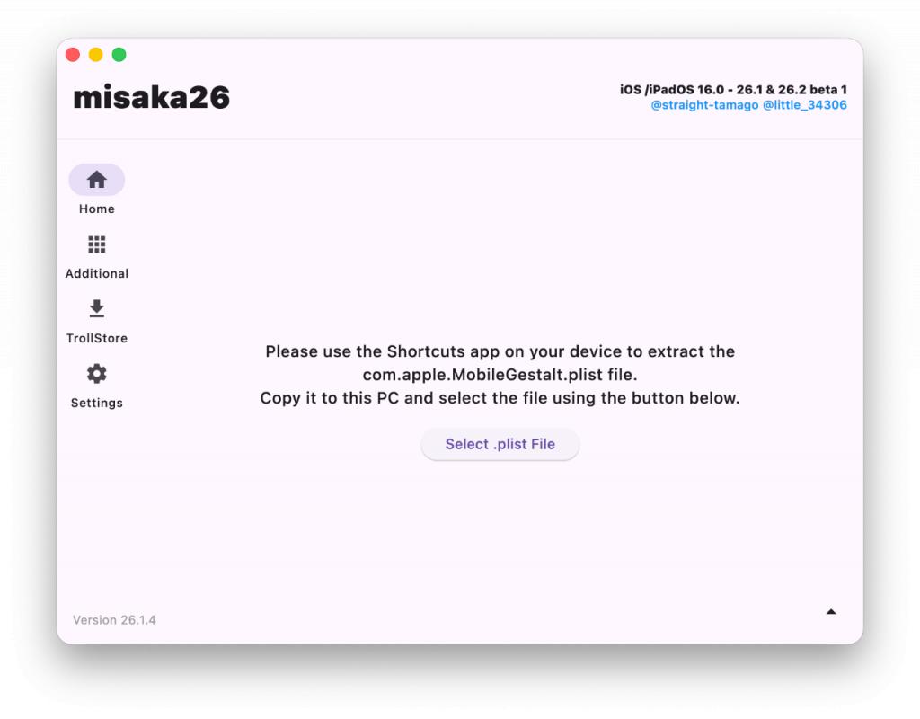 iPhone 解救电脑,在电脑上通达之前安设好的 Misaka 26,导入“ com.apple.MobileGestalt.plist ”文献,在界面中秉承你需要的功能,此次我们秉承的是“ Stage Manager ”和“ TrollPad ”,然后点击 Apply 即可。