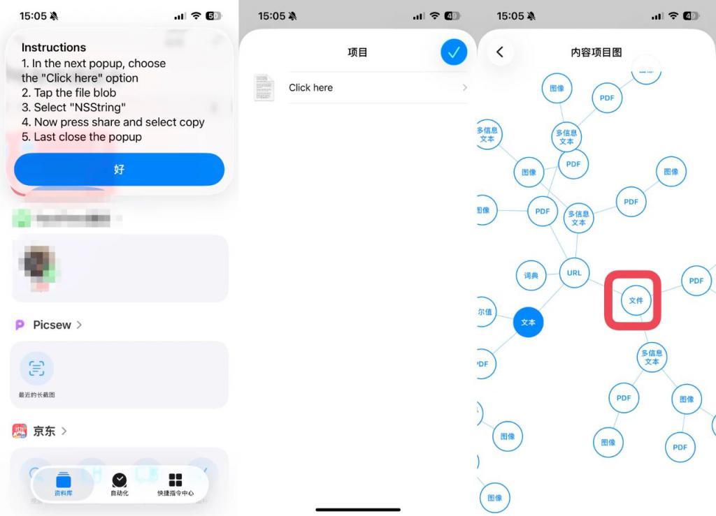 在弹出来的选项出循序点「好」、「click here」、「文献」、「NSString」,接着会出现一大段字符,然后全选,拷贝,复返,完成该快捷指示,会自动掸出究诘你保存到什么位置。