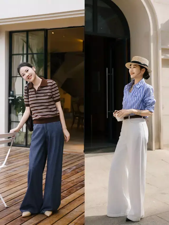 第一章节,白色裤子百搭又耐看Tips①:条纹衬衫搭配白色阔腿裤