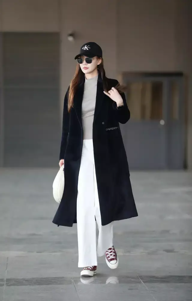 穿玄色的大衣外衣不留意照实会显得千里闷败兴,不外唯有我们遴荐一条白色的直筒裤来和它组合,就不错冲突这种千里闷感。像这位先锋达东谈主,他用一件浅灰色的真挚毛衣和紫色的帆布鞋来组合,俄顷点亮了举座造型的配色,找到了一个配色的均衡点。