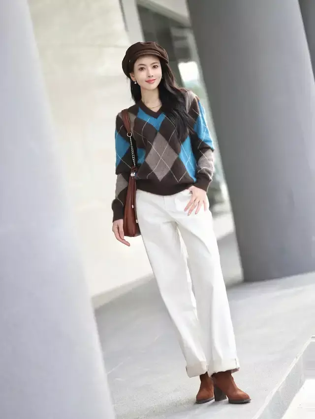 我们一定要找到色调的均衡点,不可让我方的配色过于惨白。不错像这位先锋博主一样,用棕色、蓝色、燕麦色拼接的毛衣搭配上白色的直筒阔腿裤,脚上穿的驼色的短靴,头戴的一款棕咖色的贝雷帽,加上暖色系的衣服、单品或配饰,更容易呈现出春日的氛围感,温顺又显气质。