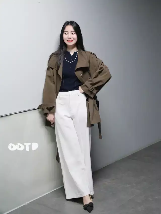 有的时辰仅仅单穿一件真挚开衫和白色的裤子照实有点单调,当我们披上一件地面色系的短风衣外衣,举座打扮会显得比拟干练。