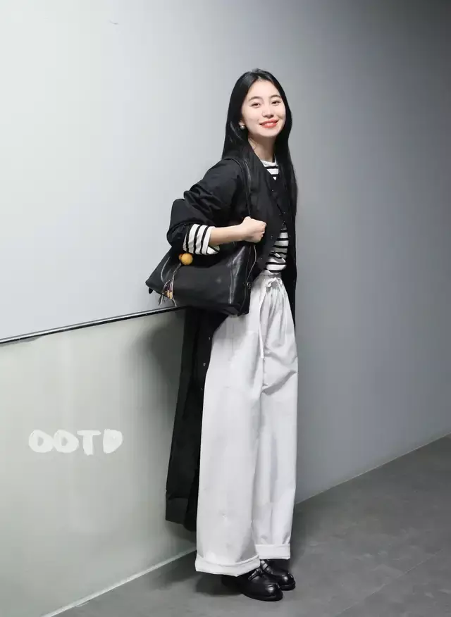 口舌搭配永不外时很经典,念念让我方的打扮比拟拉风何况低调不张扬,胜仗遴荐玄色的风衣外衣,内搭口舌条纹打底衫和一条白色的阔腿裤组合就够,脚上踩着一对玄色的圆头皮质单鞋,俄顷普及了举座穿衣打扮的精细度,更显高等。