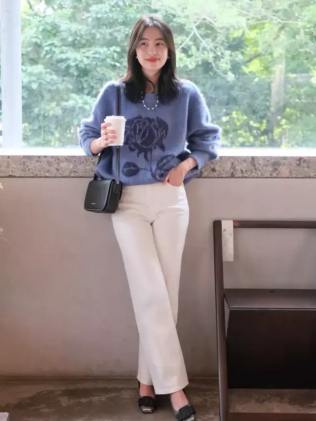 Tips②:雾霾蓝毛衣搭配白色直筒九分裤