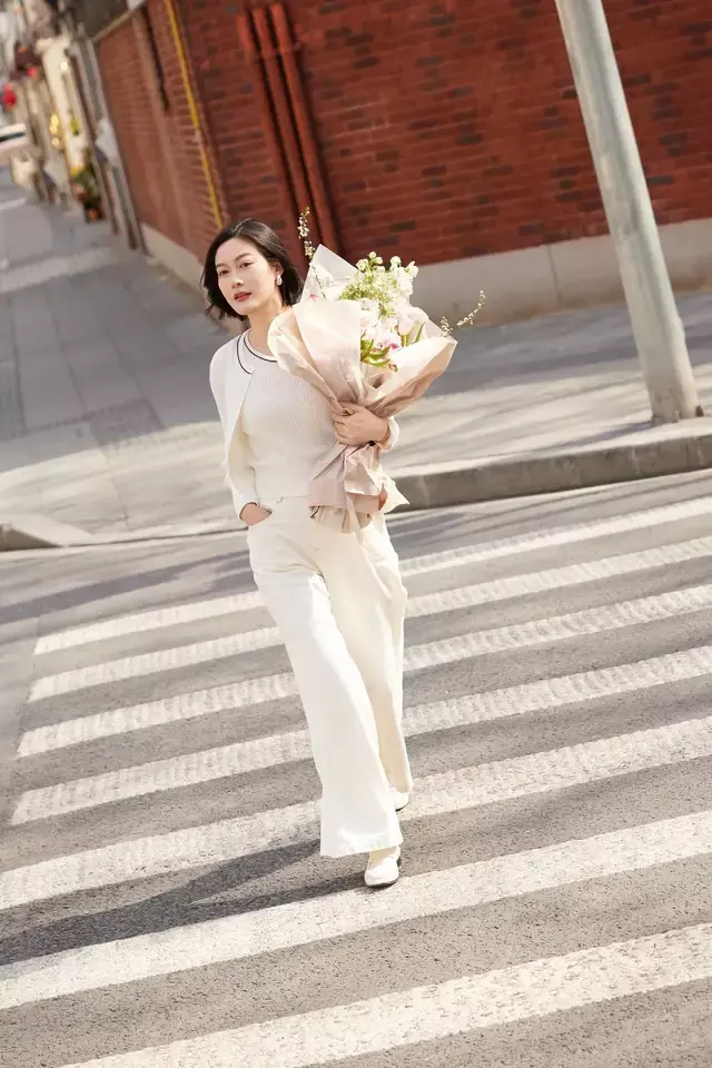 要是我们遴荐的白色裤子是纯白偏冷的情况下,穿在身上很容易显生硬,其实早春更合适奶油白、云朵白、米白这类带暖调的白色。