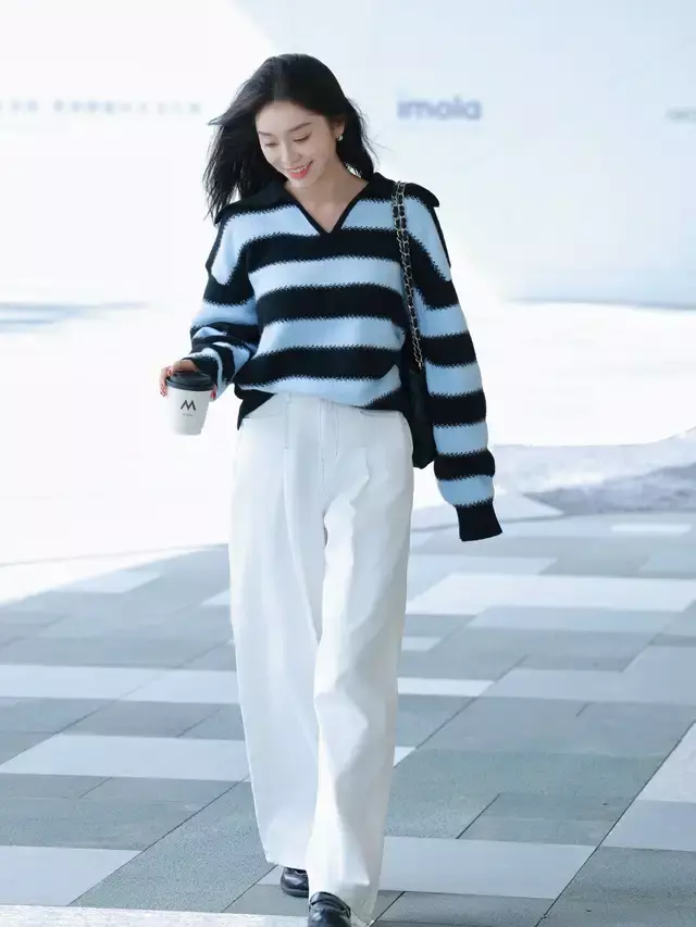 有的衣服它天生就领有先锋元素,穿在身上照实能让举座打扮更精细,冲突单调问题。上头这一套就用了玄色和雾霾蓝拼接的条纹真挚毛衣,搭配上白色的直筒阔腿裤,脚上穿戴一对乐福鞋,俄顷把春日温顺感和先锋感演绎得恰到公道。