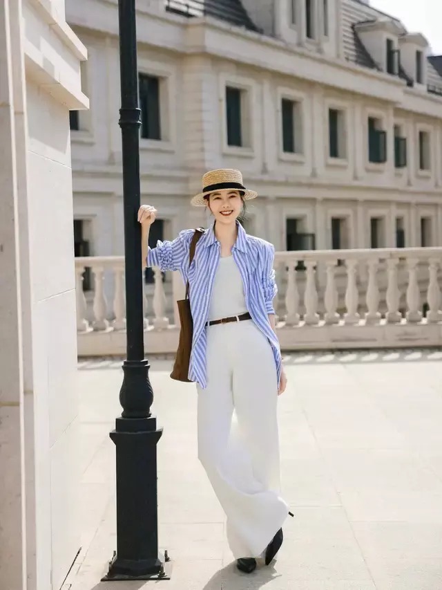 在这个早春季节,我们不错遴荐一件蓝白条纹的衬衫,内搭白色 T 恤,加上一条白色的西装阔腿裤,脚上穿的玄色的高跟单鞋,这么的穿搭从简干练,加上一顶凉帽,让举座打扮更有氛围感。