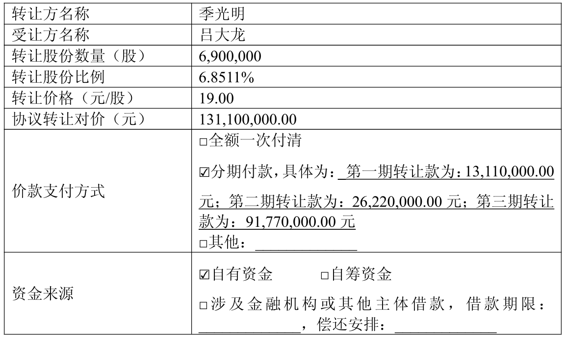 公告瓦解,本次股份转让对价为1.31亿元,转让价钱为19元/股。值得一提的是,受让方吕大龙喜悦,合同转让完成后,在握股时辰内,摈弃沿路主义股份表决权,不合所握有的主义股份进行任何方式的质押,在本次合同转让股份过户完成之日的12个月内不减握其所受让的股份。