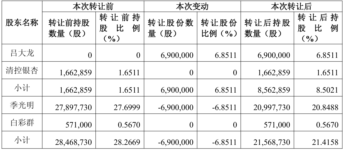 本次合同转让完成后,受让方吕大龙共握有公司股份690万股。吕大龙与清控银杏互为一致手脚东谈主,共计握有856.29万股,占公司总股本的8.5021%。季光明与公司股东白彩群互为一致手脚东谈主,共计径直握有公司股份2156.87万股,占公司总股本的21.4158%。