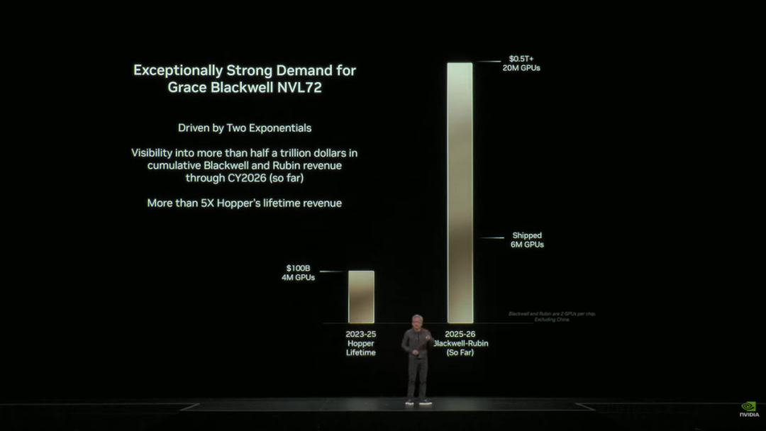 我认为,在Blackwell以及Rubin早期增长态势上,2026年咱们很可能是历史上首家能够看到5000亿好意思元业务范畴的公司。正如你所知,2025 年尚未扫尾,2026 年也尚未运行。这就是账面上的业务量,迄今为止已达半万亿好意思元。
