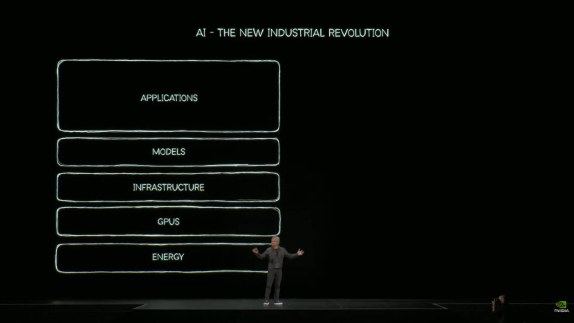 在能源之上还有这些GPU。这些GPU被通达到、集成到我稍后将展示的基础设施中。在这项基础设施之上——它由巨型数据中心组成,其范畴纯粹达到这个房间的数倍之多。巨大的能量随后通过名为GPU超等诡计机的新开辟辗转,从而生成数据。这些数字被称为tokens。