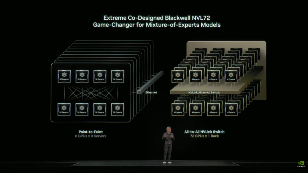 因此,这个价值数万亿好意思元的巨型AI 模子蓄积了浩荡不同领域的大师。咱们将通盘这些不同领域的大师都集会到一个 GPU 上。现在,这是 NVLink 72。咱们不错把通盘芯片都集成到一块巨型晶圆上,每位大师都能相互交流。因此,这位首席大师能够与通盘在岗的大师进行交流,以及通盘必要的高下文、指示和咱们必须处理的大宗数据,一堆tokens,咱们必须发送给通盘大师。大师们会…… 不管哪位大师被选中解答问题,都会随即尝试作出回答。