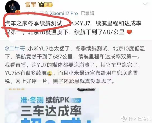 值得可贵的是,测试自己由汽车之家主导,小米方面并未径直组织。独一激发争议的,是雷军在转发时略去了“准”字,径直称之为“汽车之家冬季续航测试”,这一细节被陈震收拢,以为不够严谨。